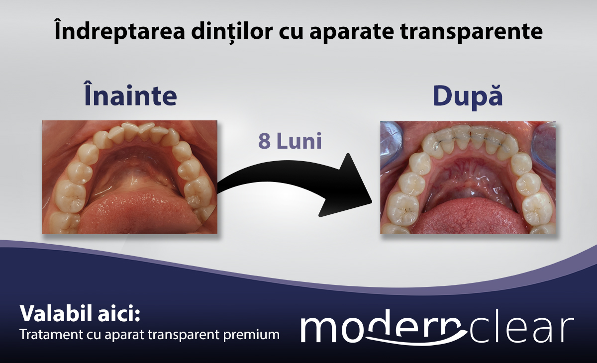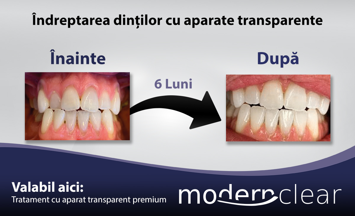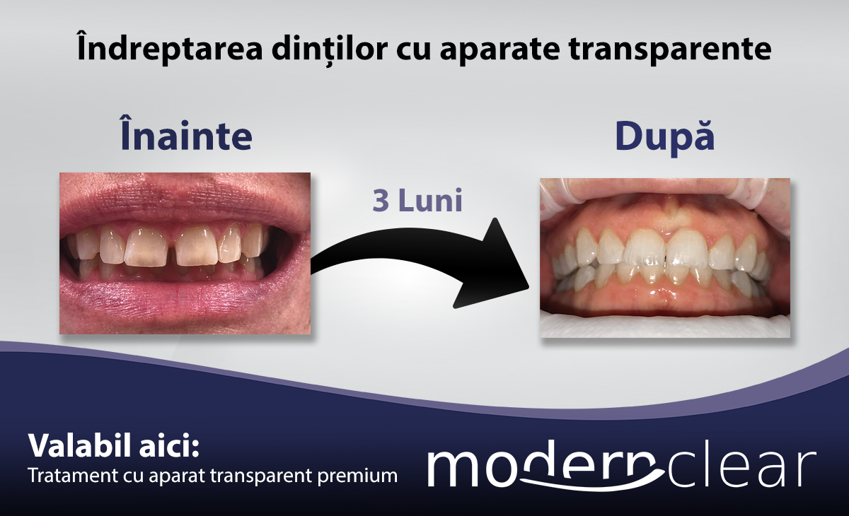 Aparatul dentar Modern Clear Aligner este unul dintre cele mai moderne tratamente de îndreptare a dinților, fiind o alternativă invizibilă a aparatelor dentare cu brackeți. Acesta are structura unei gutiere transparente și permite corectarea problemelor de aliniere a dinților. Aparatul este mobil, simplu, ușor, personalizat, confortabil, nu prezintă restricții alimentare și aproape imposibil de observat.